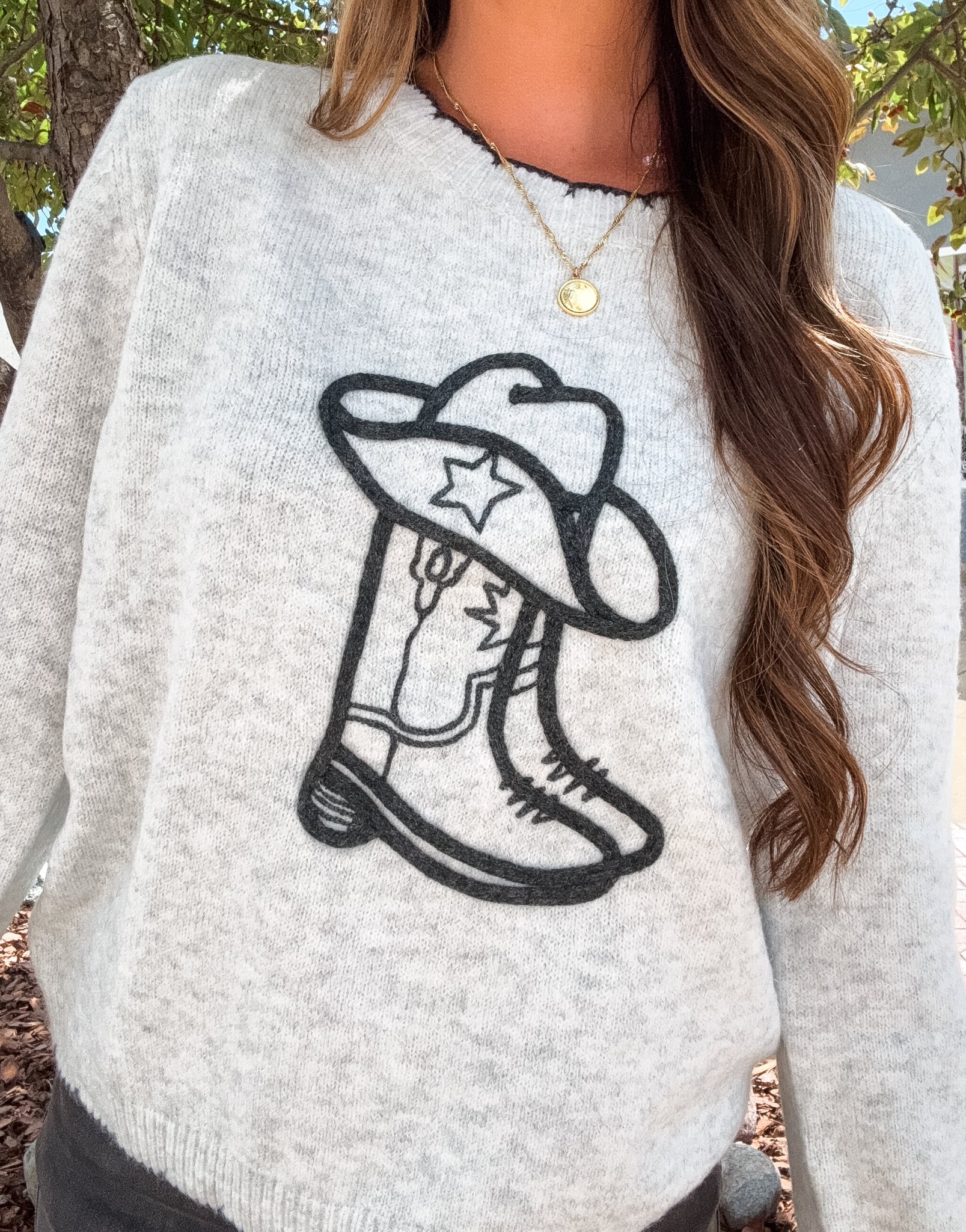 Stay cozy and stylish in the Knockin' Boots Sweater, featuring a playful light grey design with a charming graphic of a cowboy hat and boot. Perfect for adding a bit of western flair to your casual look, this sweater combines comfort with a fun, spirited vibe you’ll love to wear anywhere.